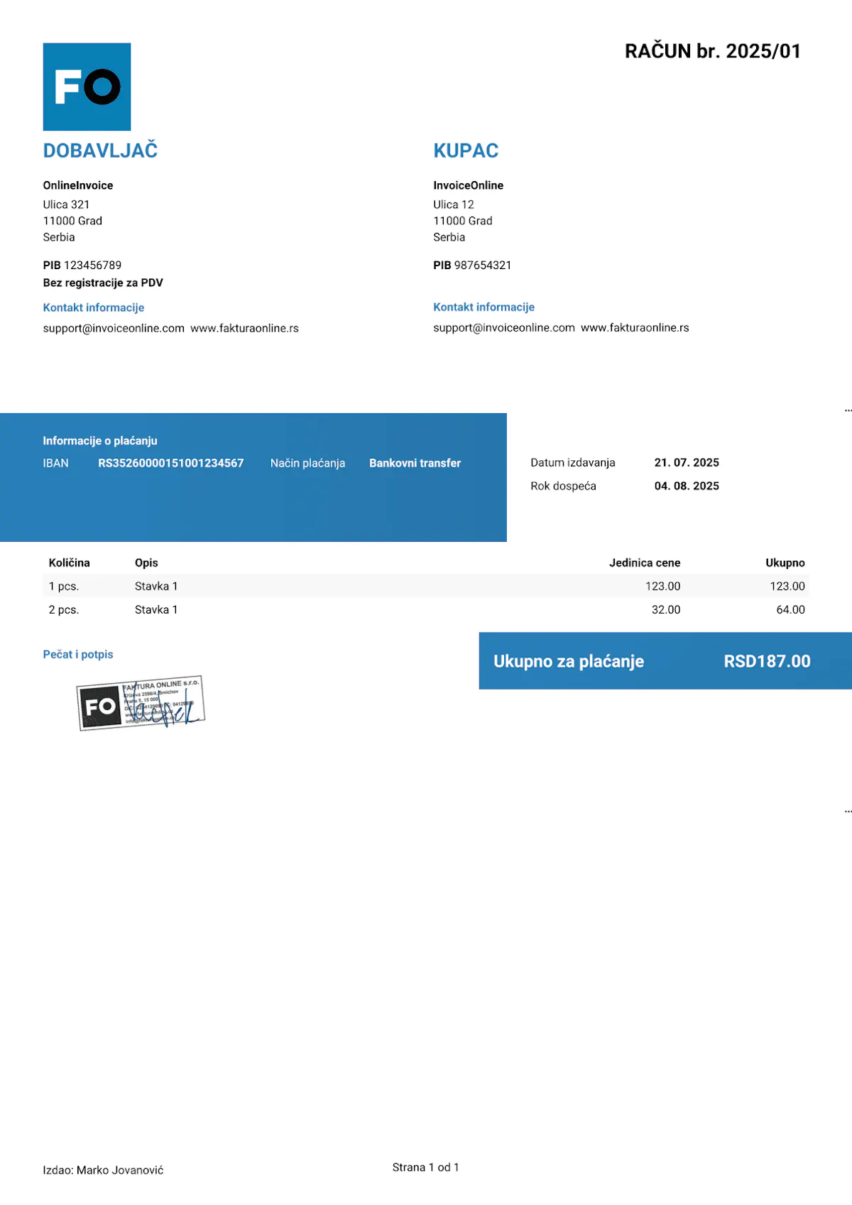 Naziv i broj fakture – jedinstven broj u okviru vaše numeričke serije (npr. „Faktura br. 2025-0012").