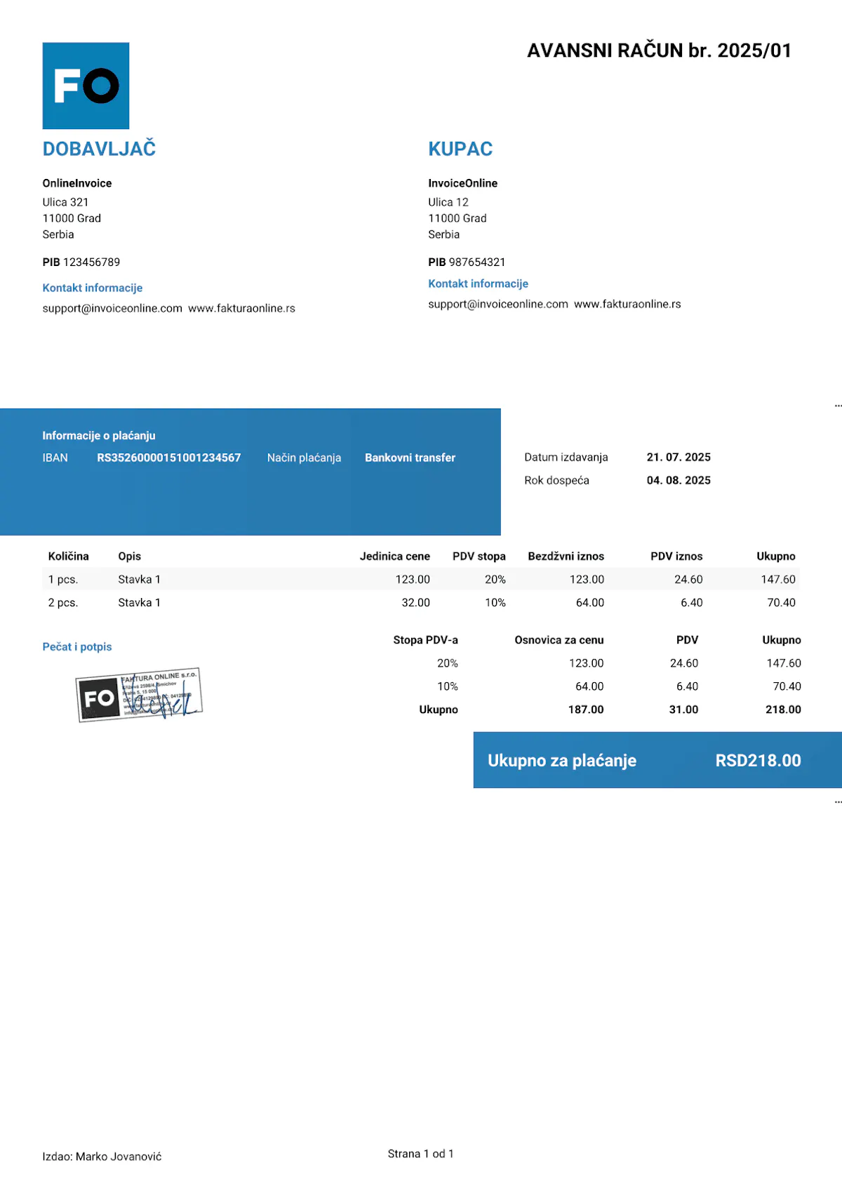 Poreska stopa i iznos PDV-a – obračunat PDV sadržan u avansnoj uplati (opšta stopa 20% ili snižena 10%).